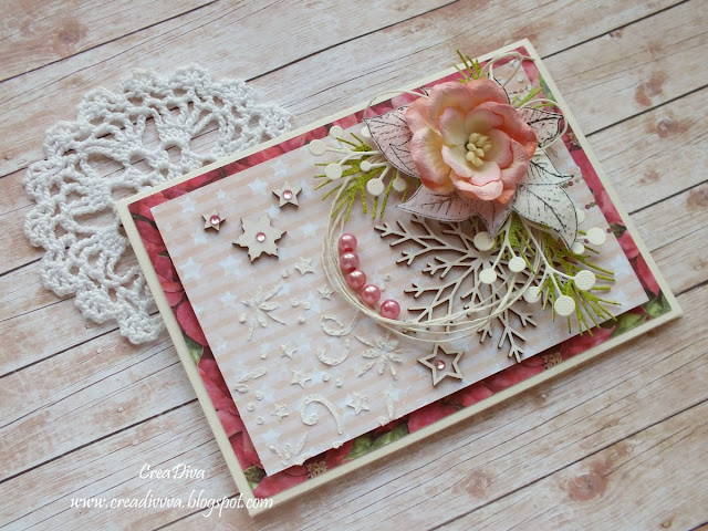 Użyłam papierów Altair Art z kolekcji "Festive Cats" i "Festive Bells" oraz tekturek gwiazdek z Agaterii. Embossing z użyciem pasty strukturalnej zrobiłam przy pomocy zimowej maski, również z Agaterii.