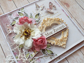 Moja kartka jest dość wiernym odwzorowaniem oryginału, chociaż różni się małymi szczegółami. Użyłam papierów "Mysterous Garden" AltairArt, dodałam kwiaty, wycinane elementy, ramkę-serduszko z lekkiej masy (miałam ją już od dawna, ale do tej pory nie wiedziałam jak jej użyć, a tu przydała się idealnie) . W tle widać embossing na gorąco. Całość lekko pozłociłam - ramkę delikatnie musnęłam złotą farbą, a kwiaty posypałam złotymi drobinkami.